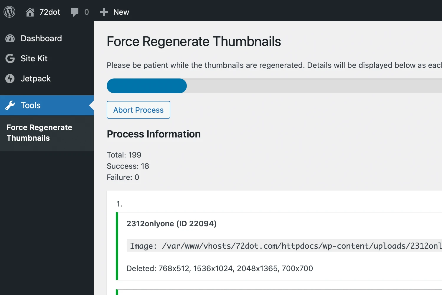 However, since we’ve set WordPress to generate no additional image sizes (__return_empty_array), the plugin will only perform the deletion step — without creating any new images.