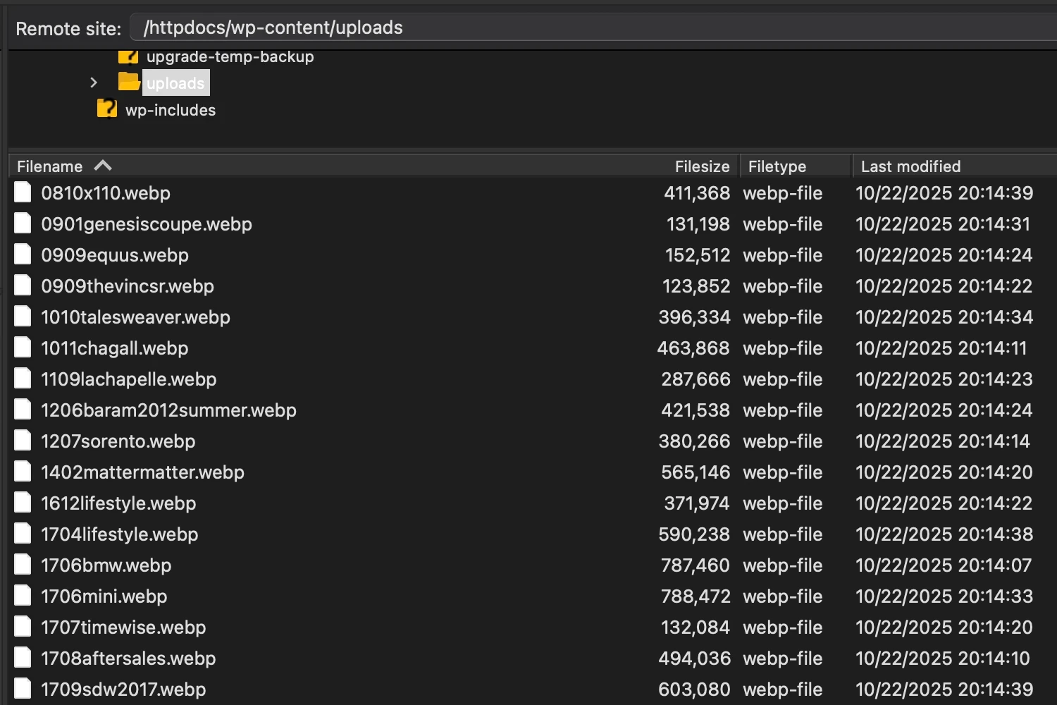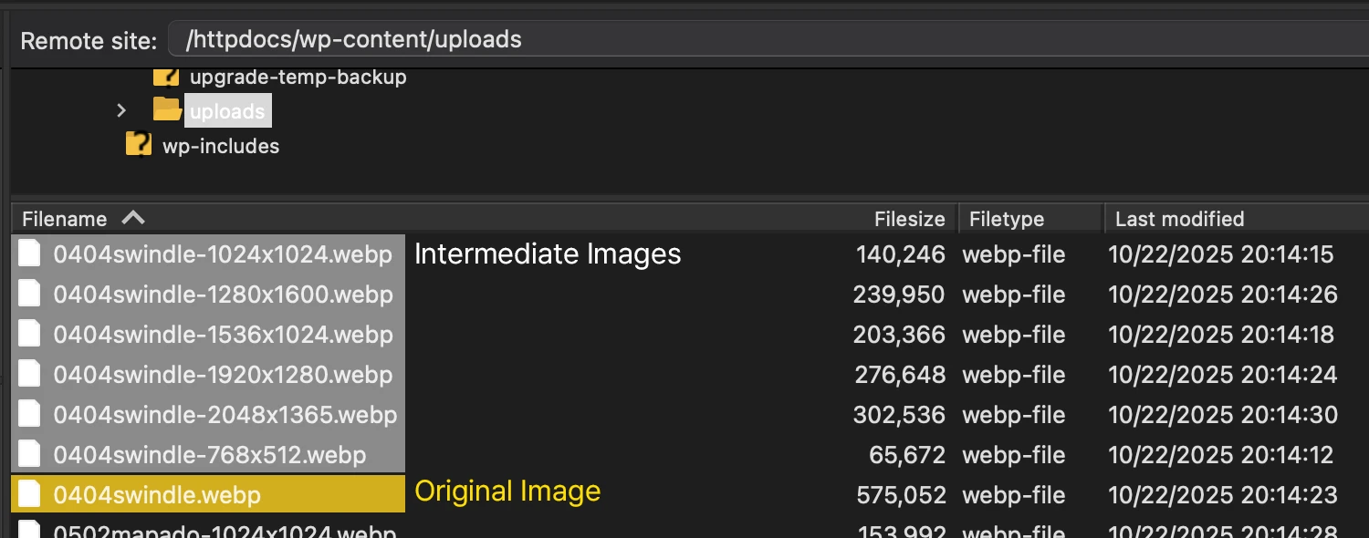 If you check your /uploads folder via FTP, you’ll likely see many derivative files with names like -1024×1024 or -1536×1024 appended to them.